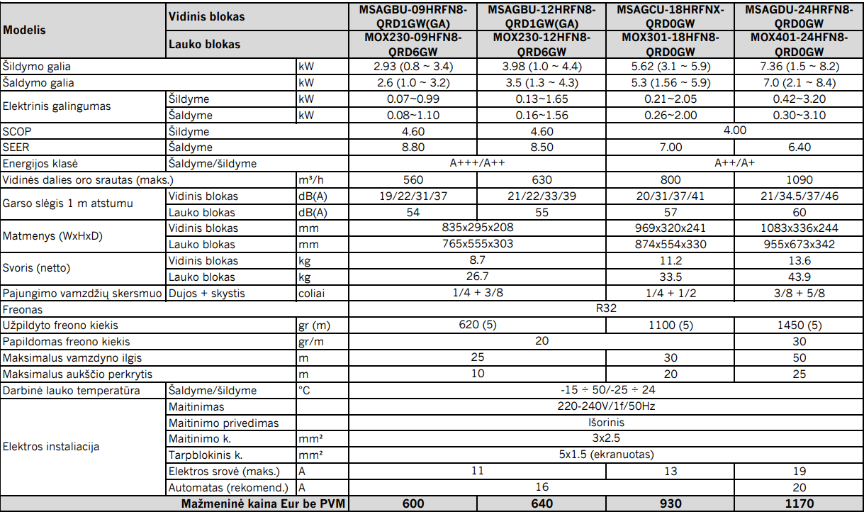 • Aukštas energijos efektyvumas: SEER (sezoninis energijos efektyvumo koeficientas) siekia iki 8,80, o SCOP (sezoninis efektyvumo koeficientas) – iki 4,60, užtikrinant mažesnes energijos sąnaudas ir aukščiausią A+++ energijos efektyvumo klasę.
